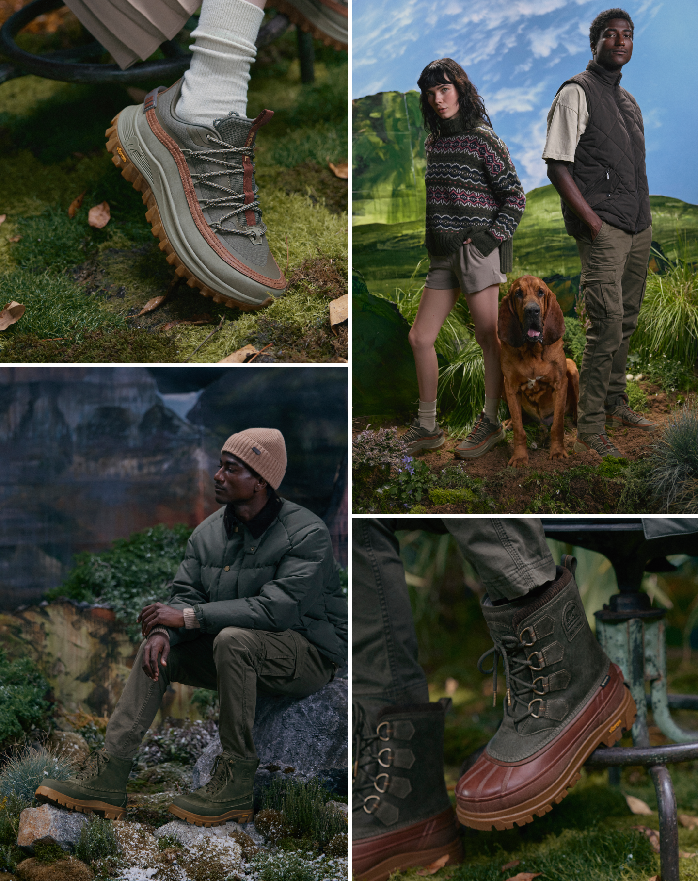 Im Zentrum stehen drei Schuhmodelle, die SORELs Handwerkskunst mit Barbours minimalistischem
